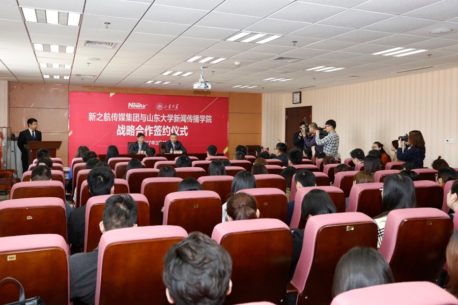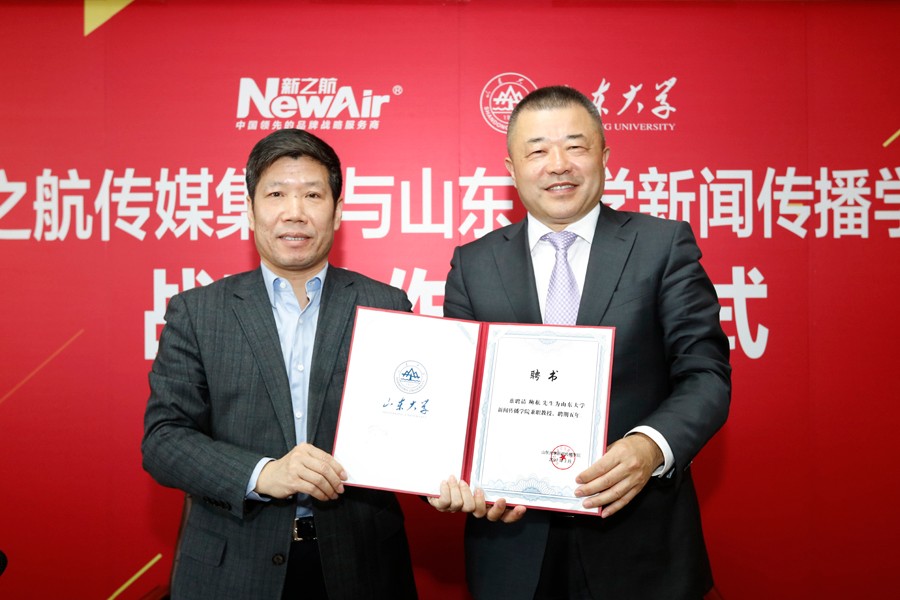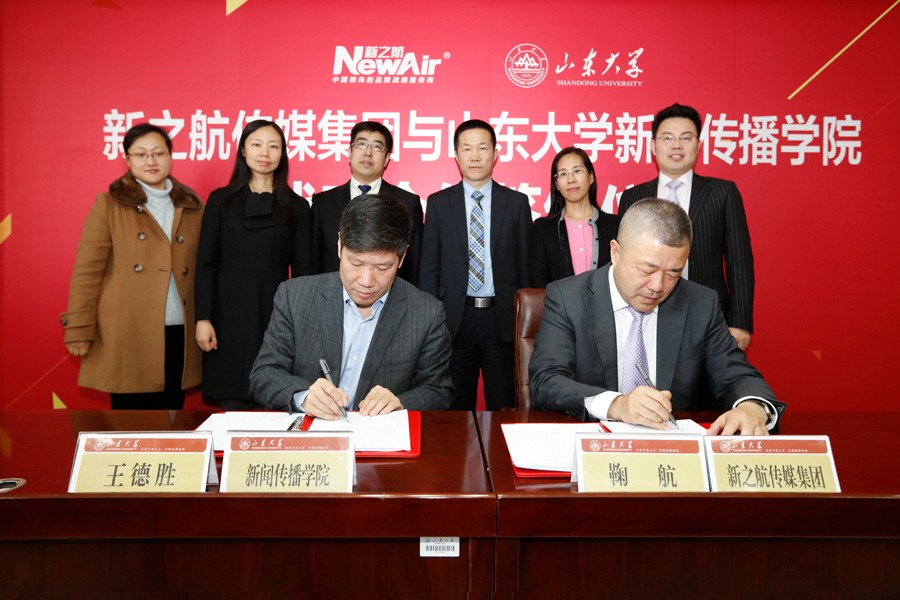 3月10日上午,新之航传媒集团与山东大学新闻传播学院举行战略合作签约仪式,双方紧密合作打造政府和企业品牌价值倍增服务平台、将在品牌广告传播研究、新媒体融合发展规划等领域进行广泛深入的战略战术多层面合作。山东大学新闻传播学院党委书记王德胜、副院长刘明洋、刘悦坦、院党委副书记王欣、新之航传媒集团有限公司董事长鞠航、总经理于涛、副总经理王玉杰、山东航空新之航传媒有限公司总经理刘占虎等双方领导出席签约仪式。签约仪式由新闻传播学院副院长刘悦坦主持,新之航传媒集团员工代表、新闻传播学院师生代表等共同出席了签约仪式。签约仪式上,新之航传媒集团董事长鞠航受聘为山东大学新闻传播学院兼职教授。