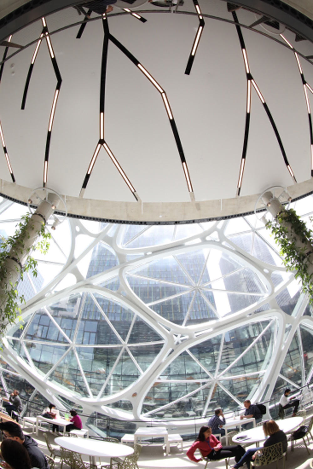 玻璃穹顶结构使用钢框架和夹层玻璃建造,每个球体需要2643个面板