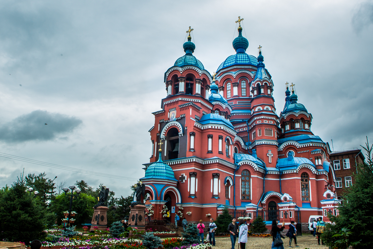 最具特色的喀山圣母大教堂是伊尔库兹克市最大的东正教教堂。教堂外观以砖红色为主,仿佛一座巨大的城堡。进入教堂女性需围头巾,男性要戴眼镜,以示尊重。